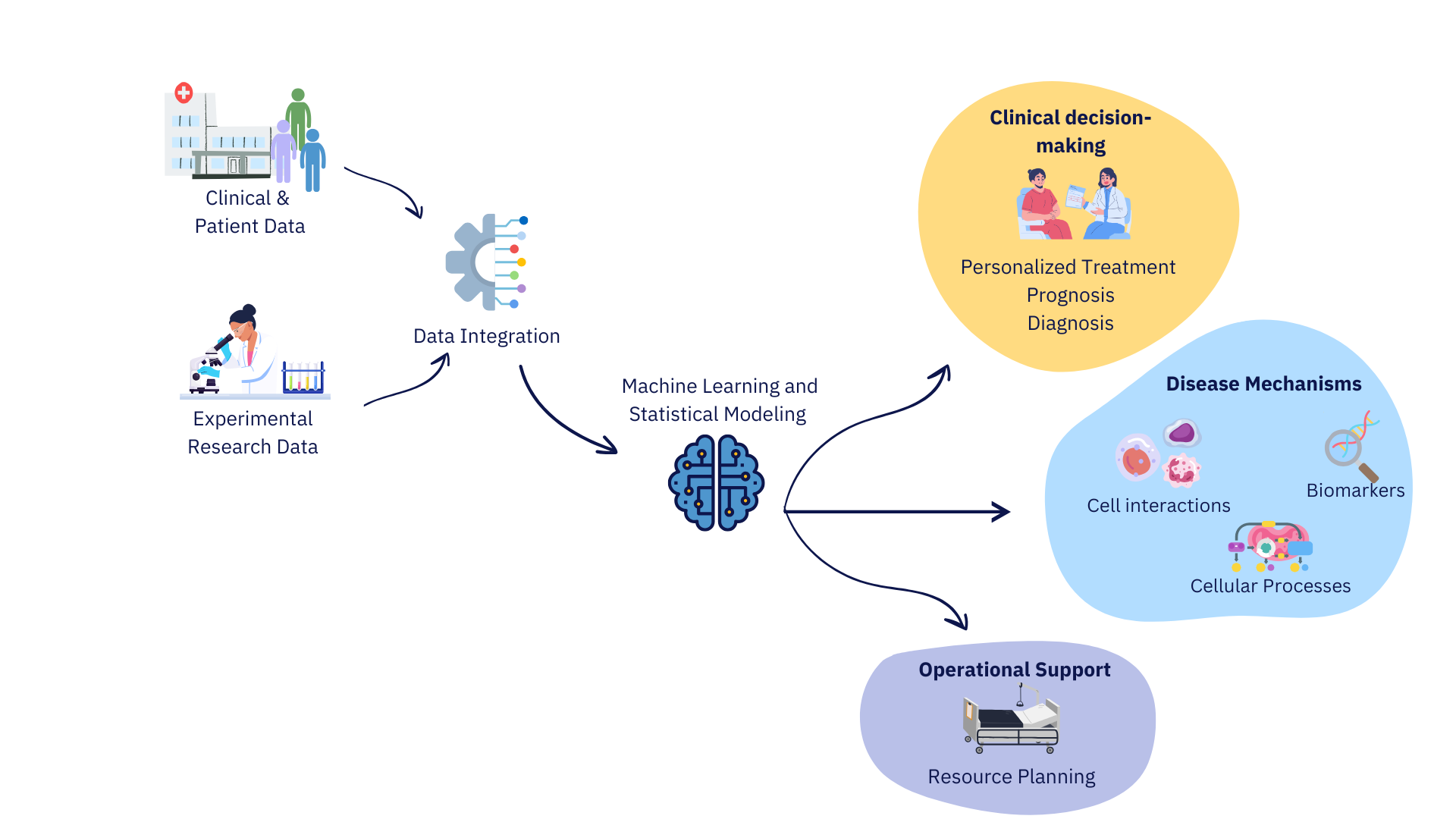 We work with heterogeneous sources such as electronic health records, medical images, and genomic, transcriptomic, proteomic, and cellular data, connecting molecular processes with patient level information in a unified analytical framework.